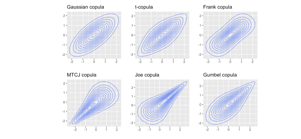 Contour plot of different bivariate density function where marginals are \(N(0, 1)\), reproduced from Chang (2019). Retrieved from https://bochang.me/blog/posts/copula/.