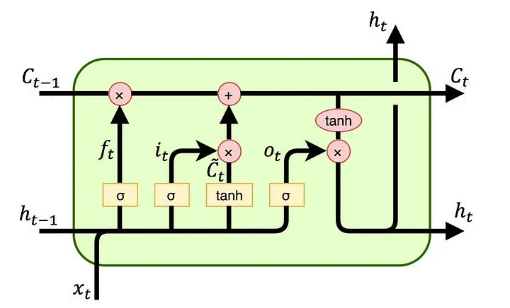 Let \(c_t\) and \(h_t\) denote the cell and the hidden state vector. Let \(f_t\), \(i_t\), and \(o_t\) represent the forget, the input, and the output gate vector at time \(t\), respectively. Then, an LSTM unit can be expressed as: