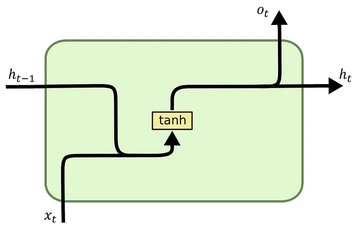 Let \(x_t\), \(h_t\), and \(o_t\) denote the input data, the hidden state, and the output at time \(t\), respectively. Then, an RNN unit can be expressed as: