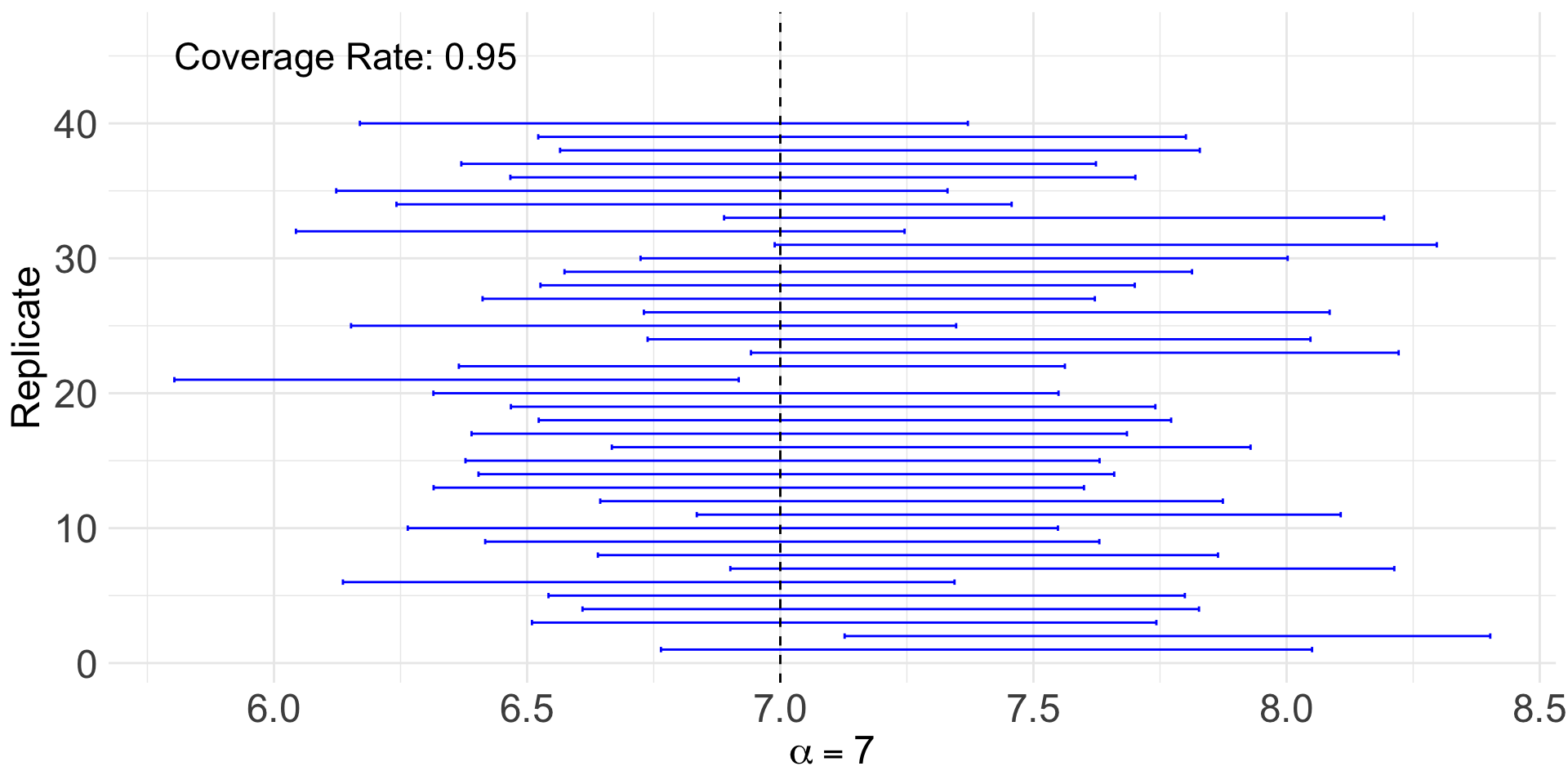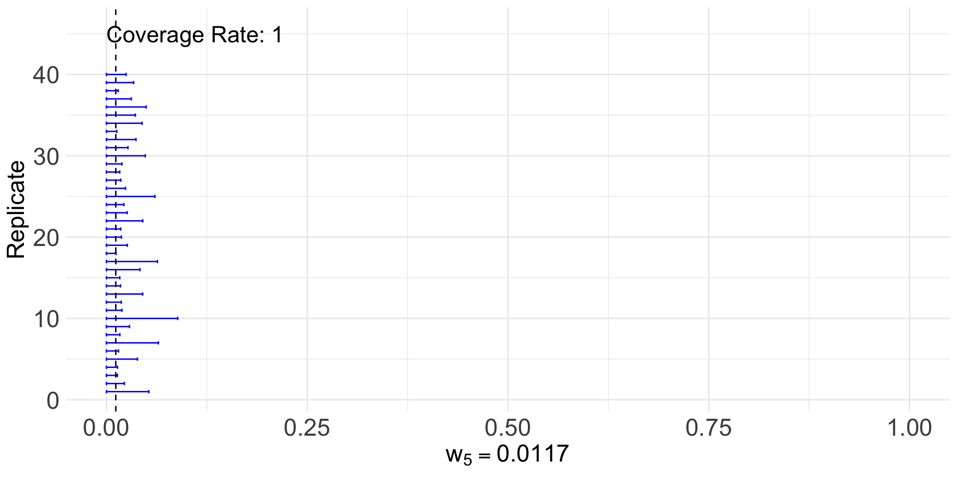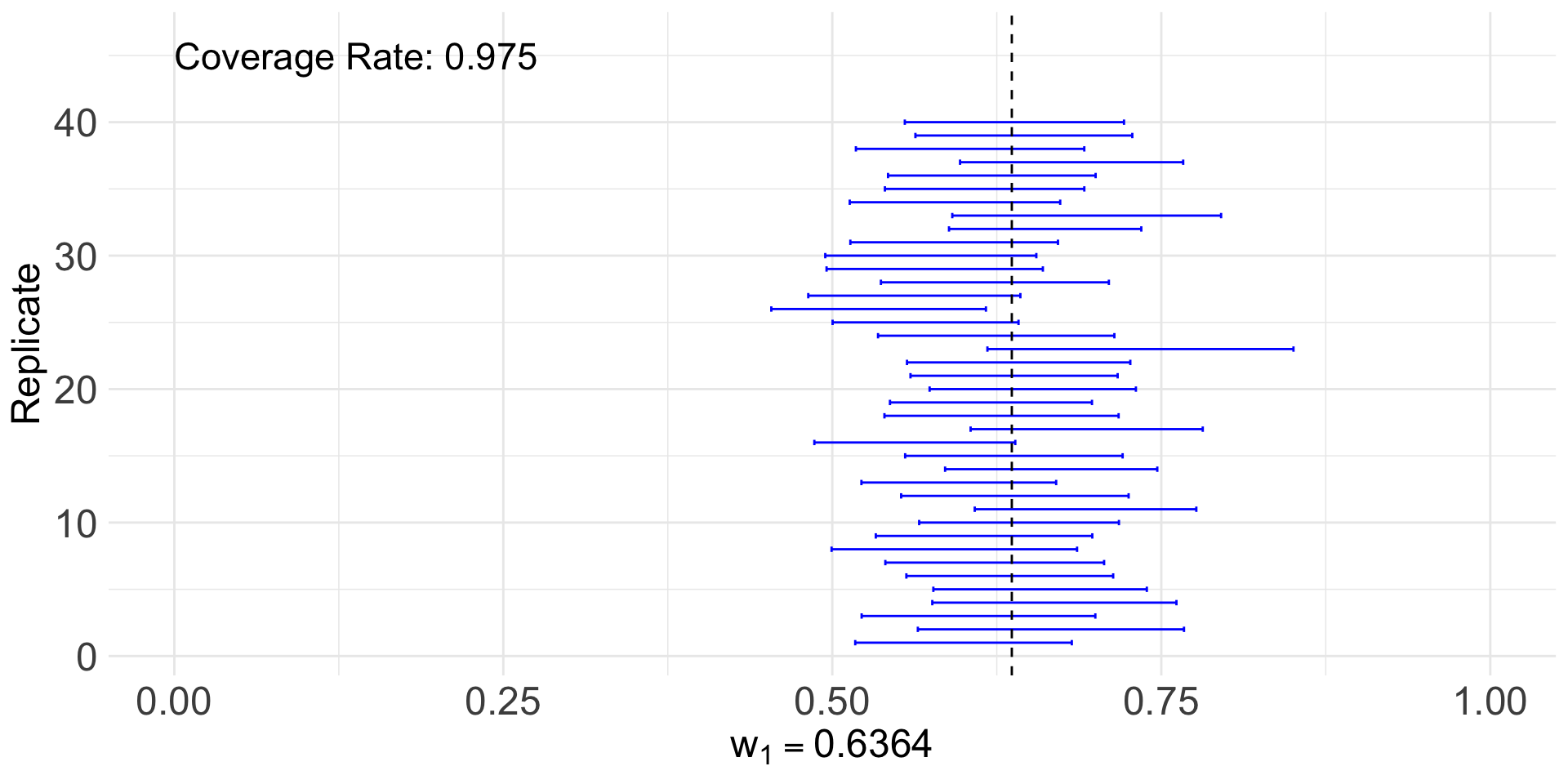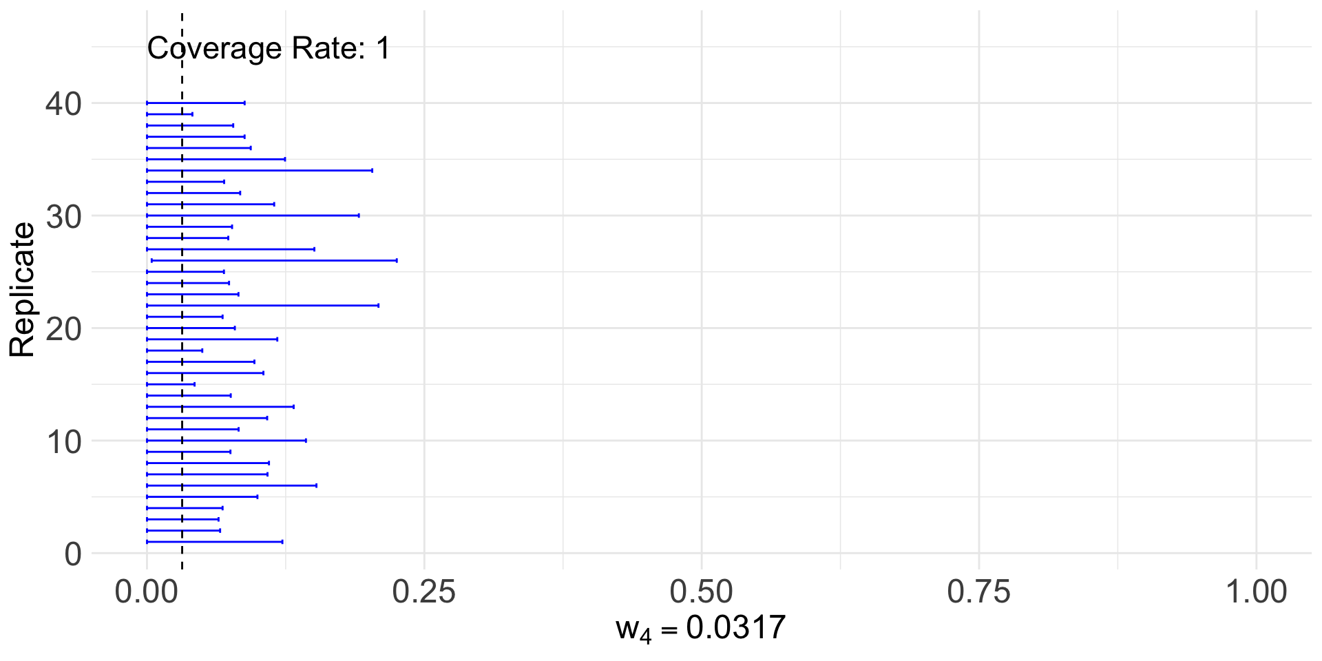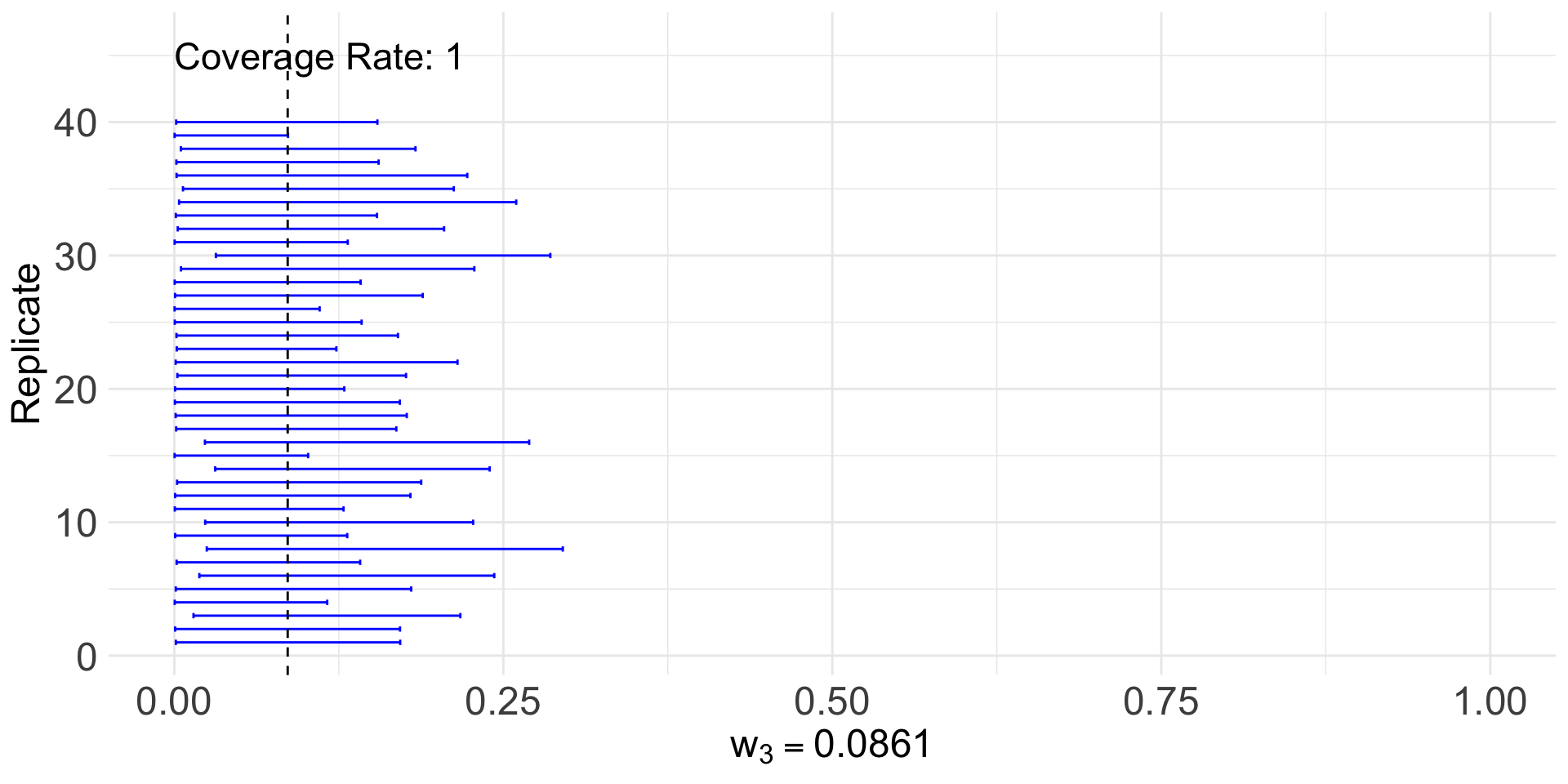 Simulate \(40\) replicates, combine \(4\) chains of \(8,000\) samples, calculate \(95\%\) CI, and record whether the true parameter value falls within this interval.