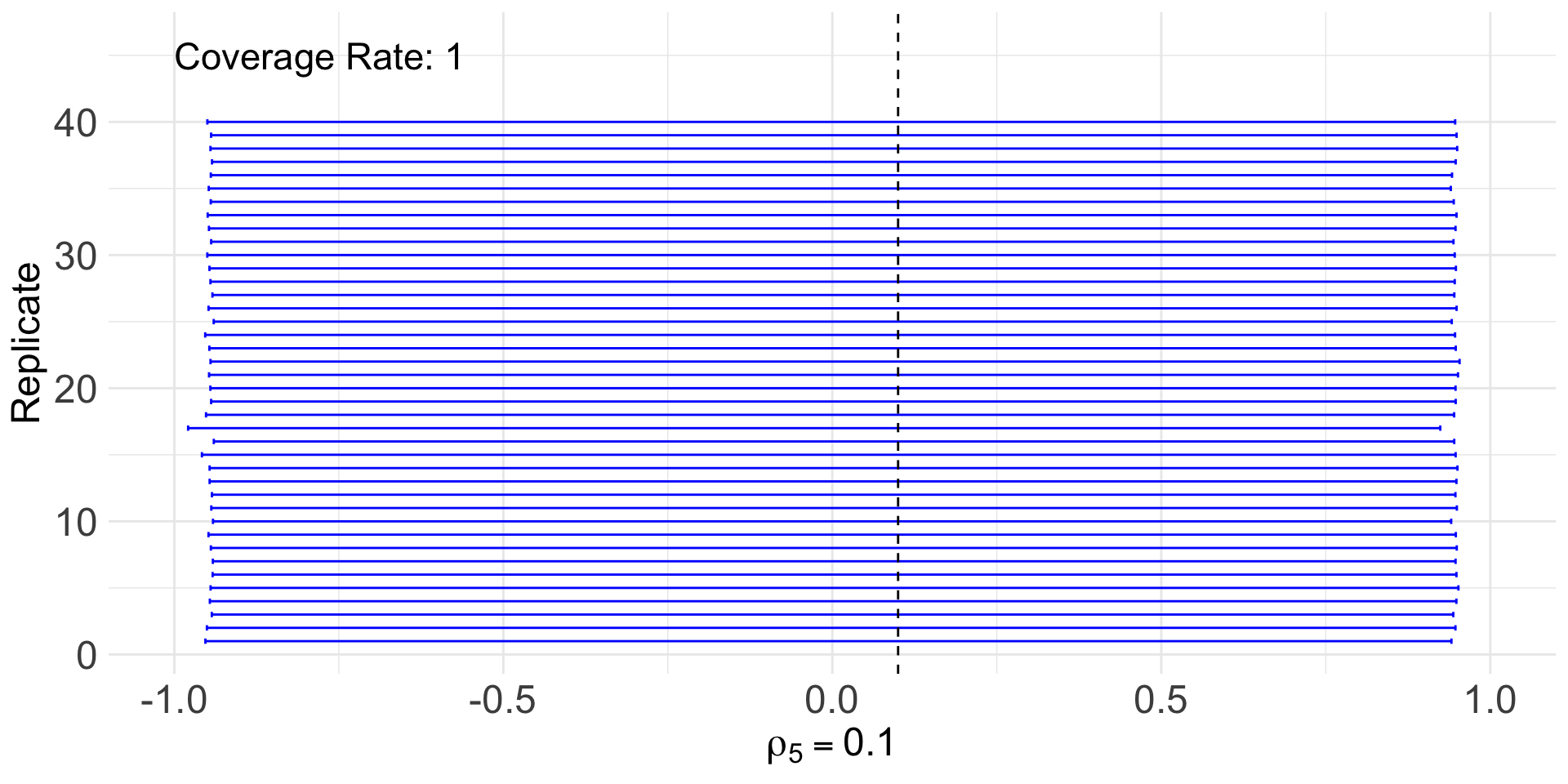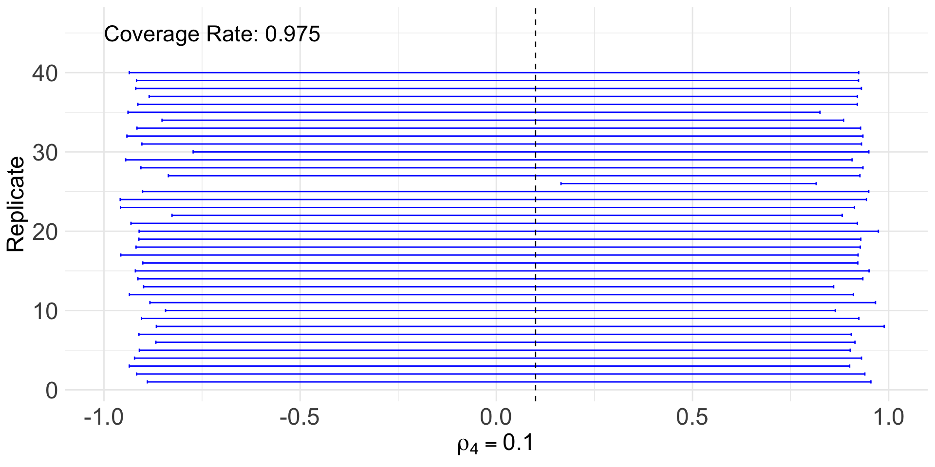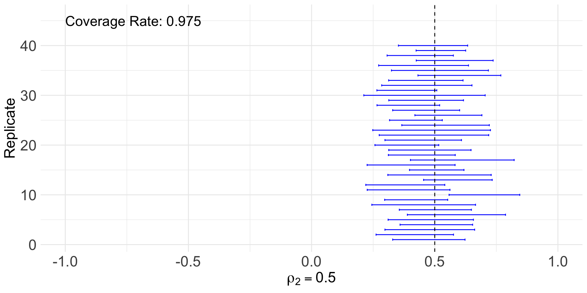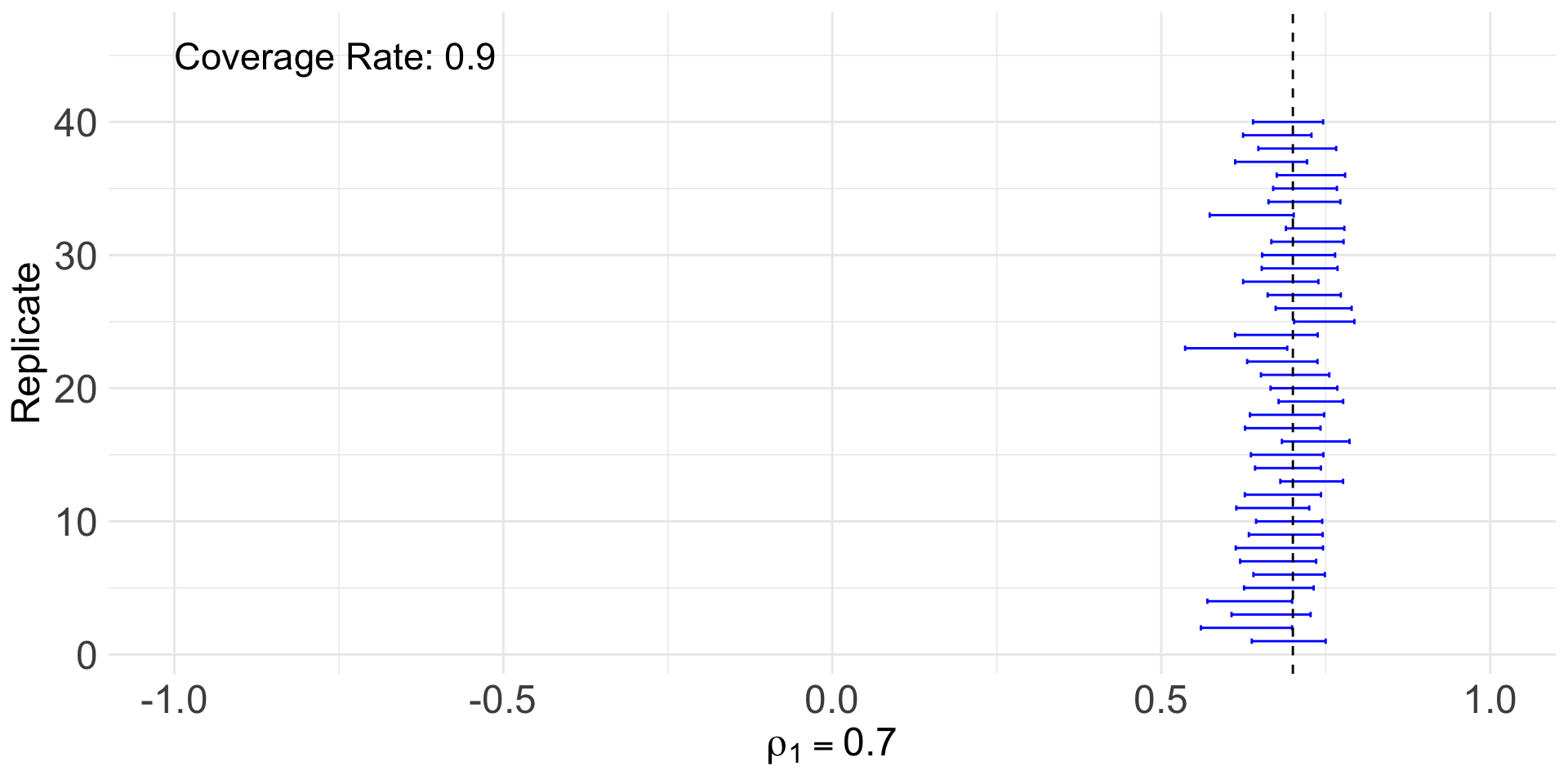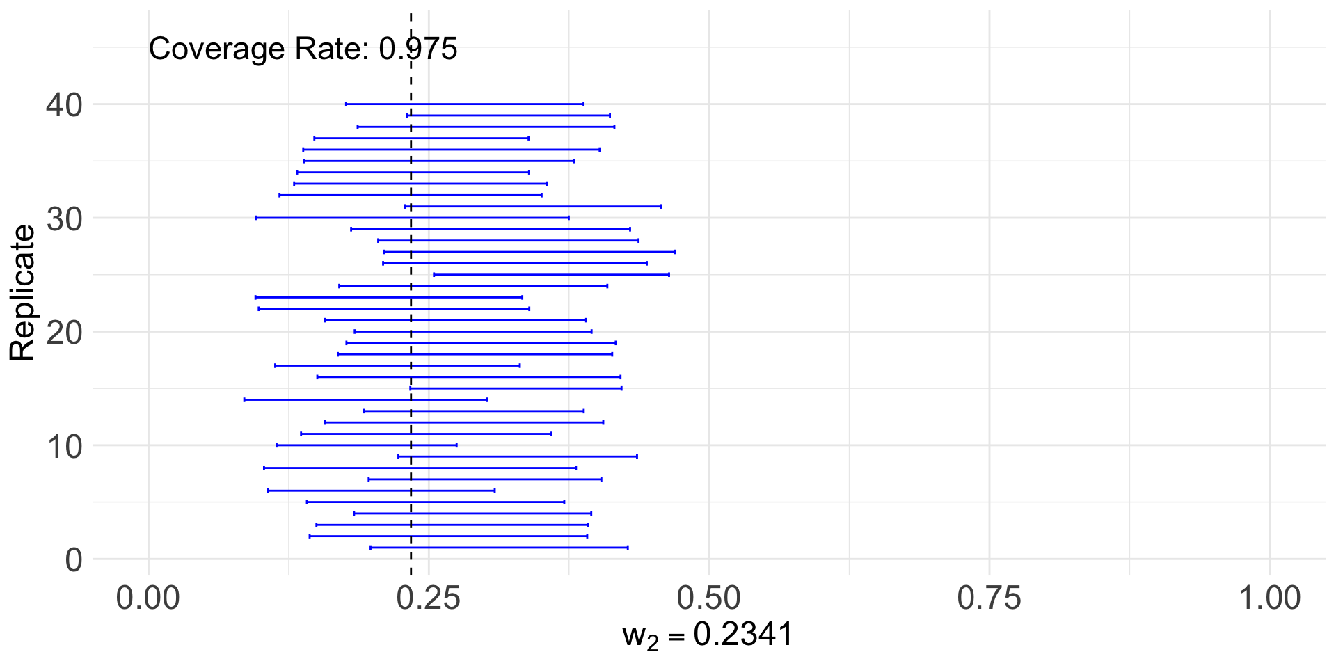 Simulate \(40\) replicates, combine \(4\) chains of \(8,000\) samples, calculate \(95\%\) CI, and record whether the true parameter value falls within this interval.