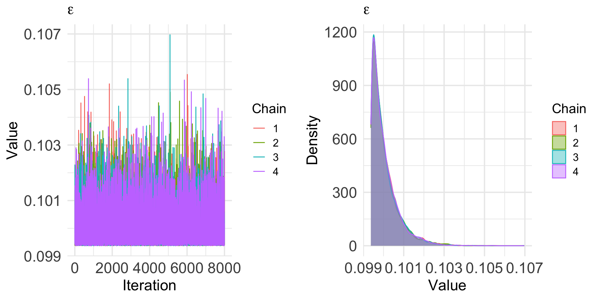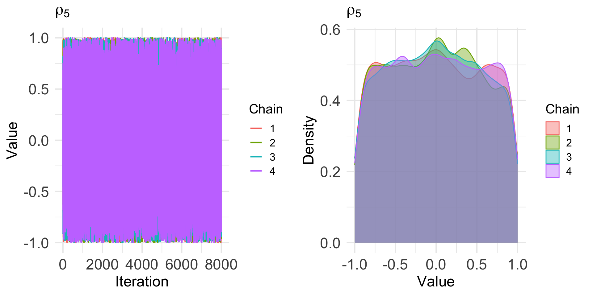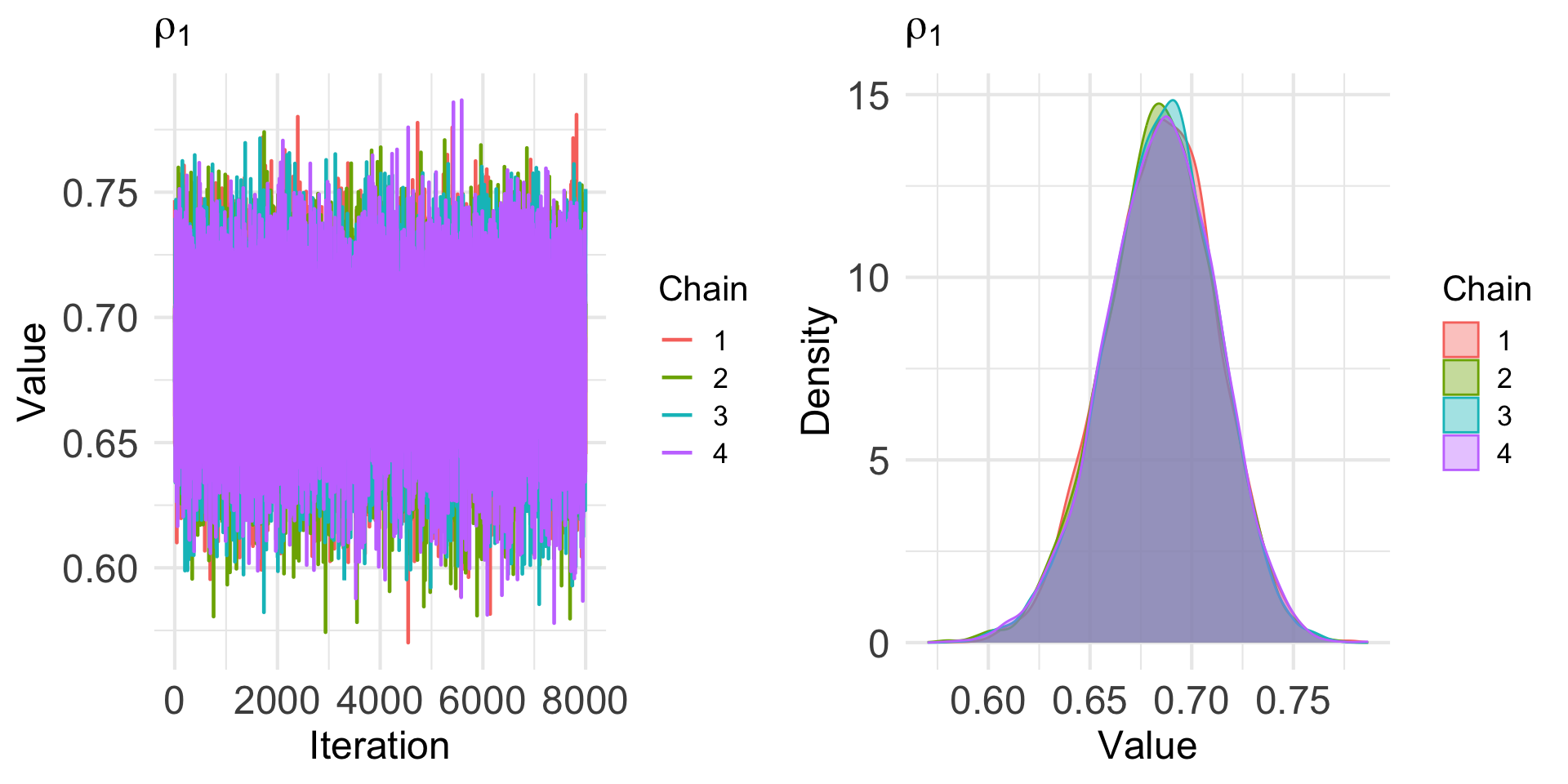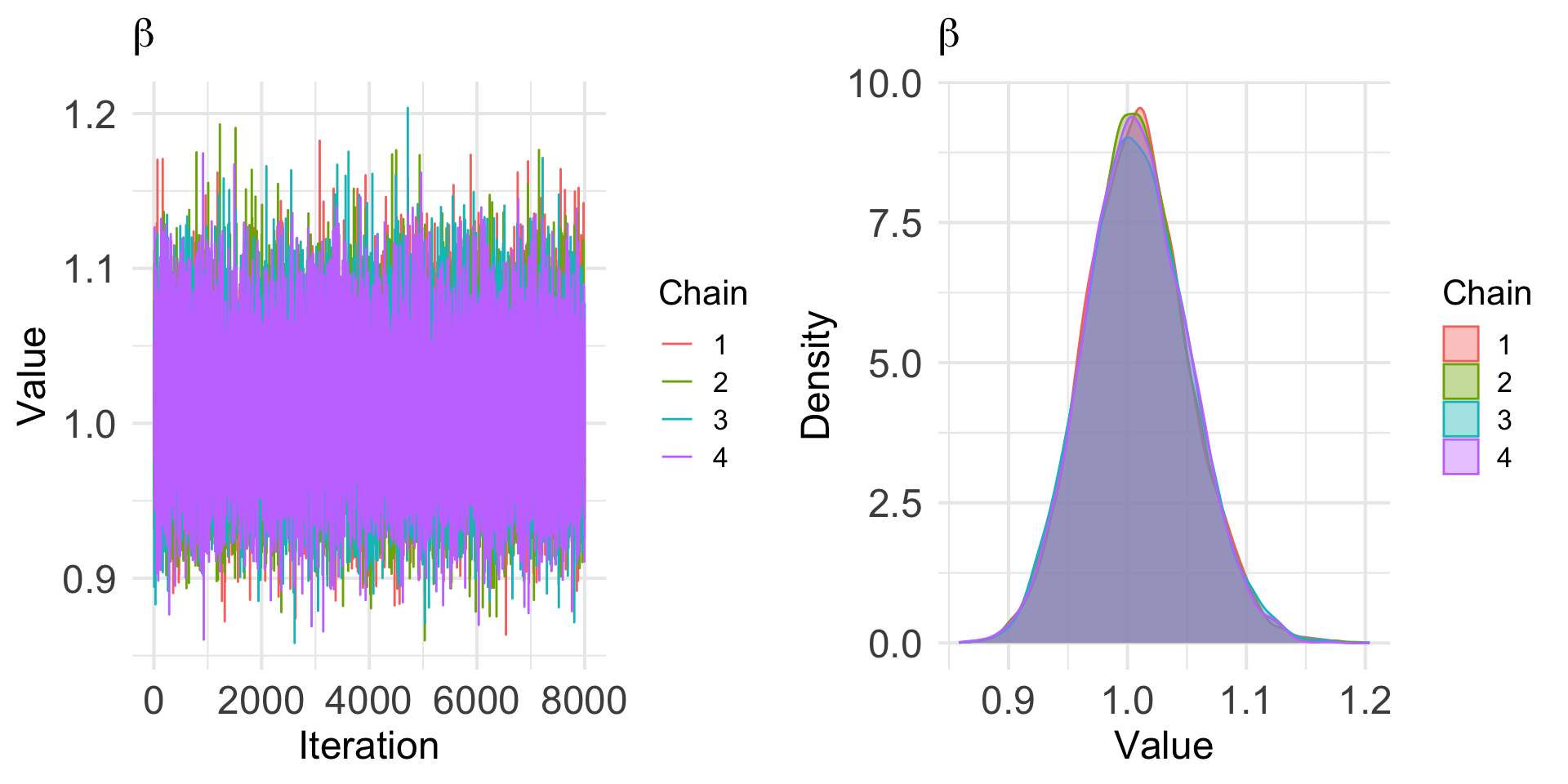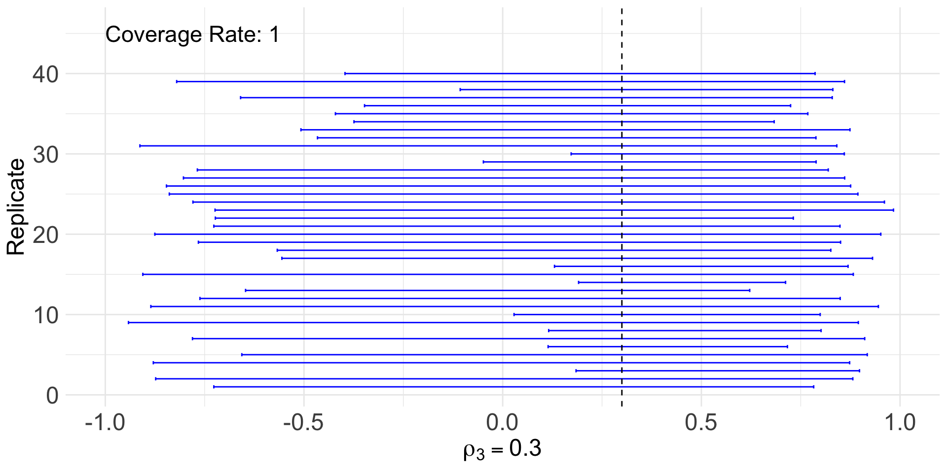 Simulate \(40\) replicates, combine \(4\) chains of \(8,000\) samples, calculate \(95\%\) CI, and record whether the true parameter value falls within this interval.