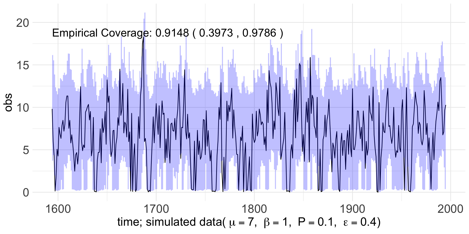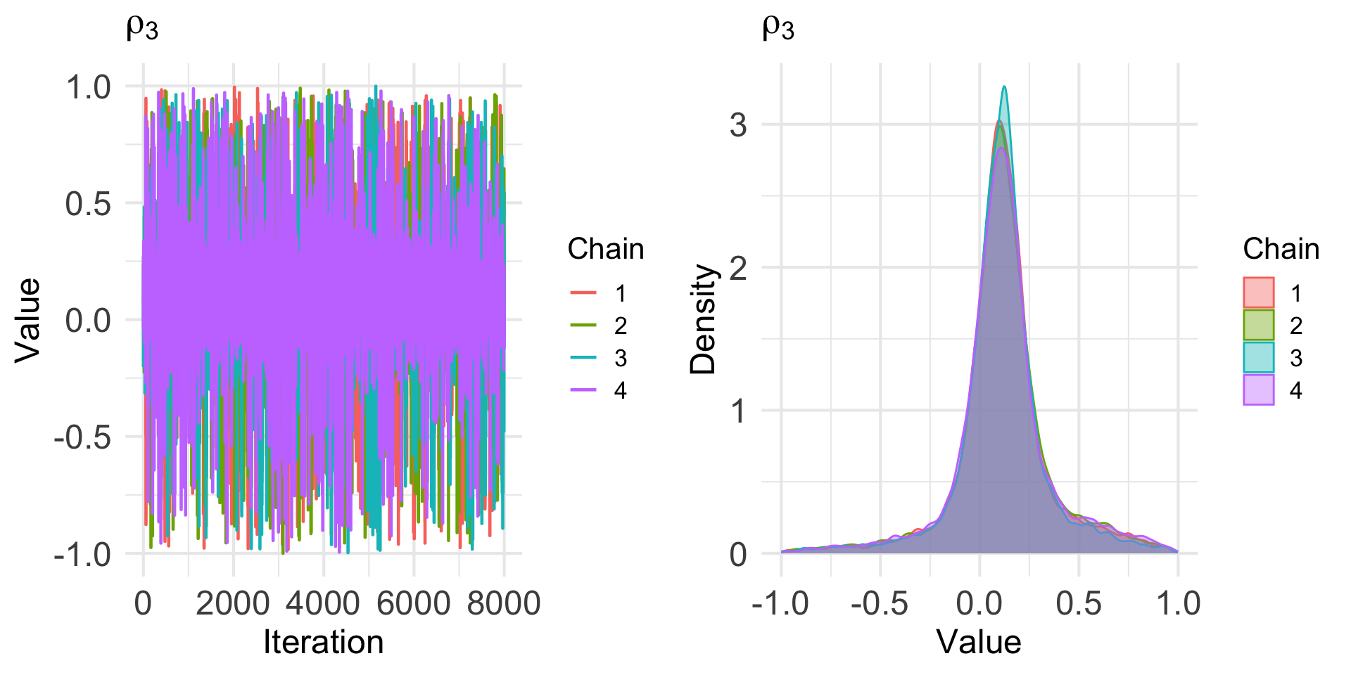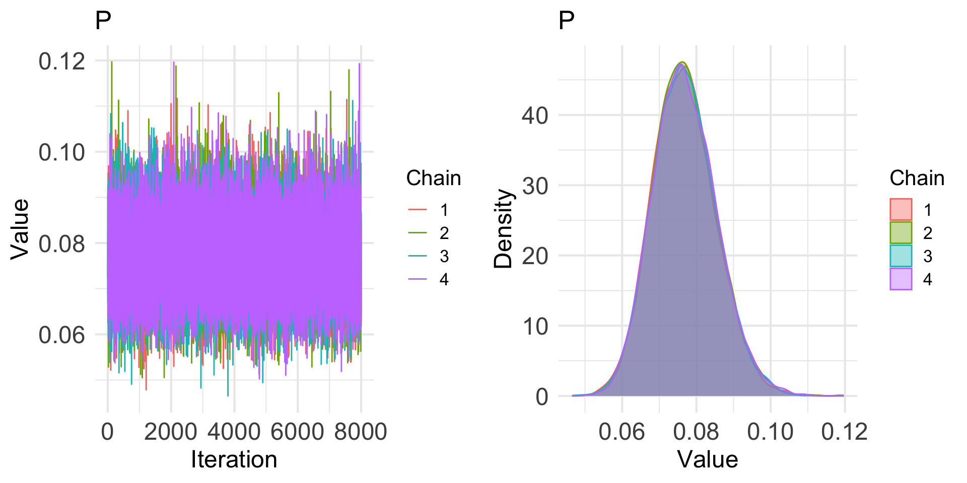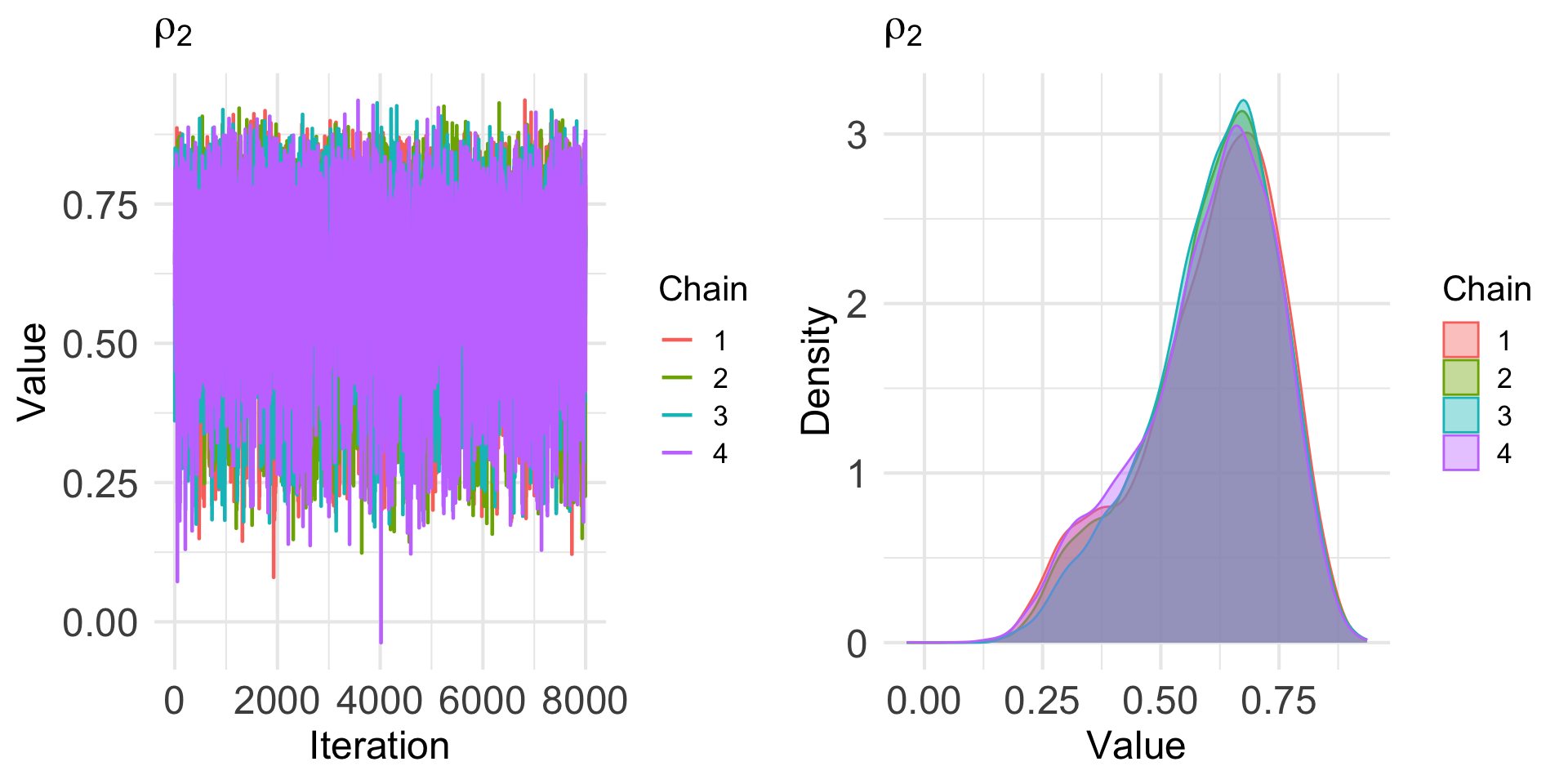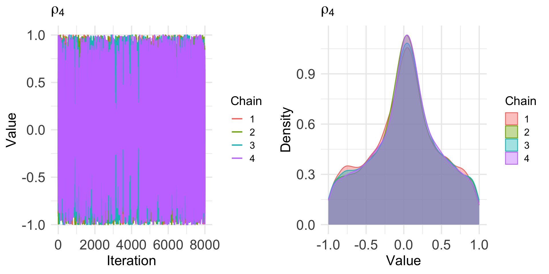 Simulate \(40\) replicates, combine \(4\) chains of \(8,000\) samples, calculate \(95\%\) CI, and record whether the true parameter value falls within this interval.