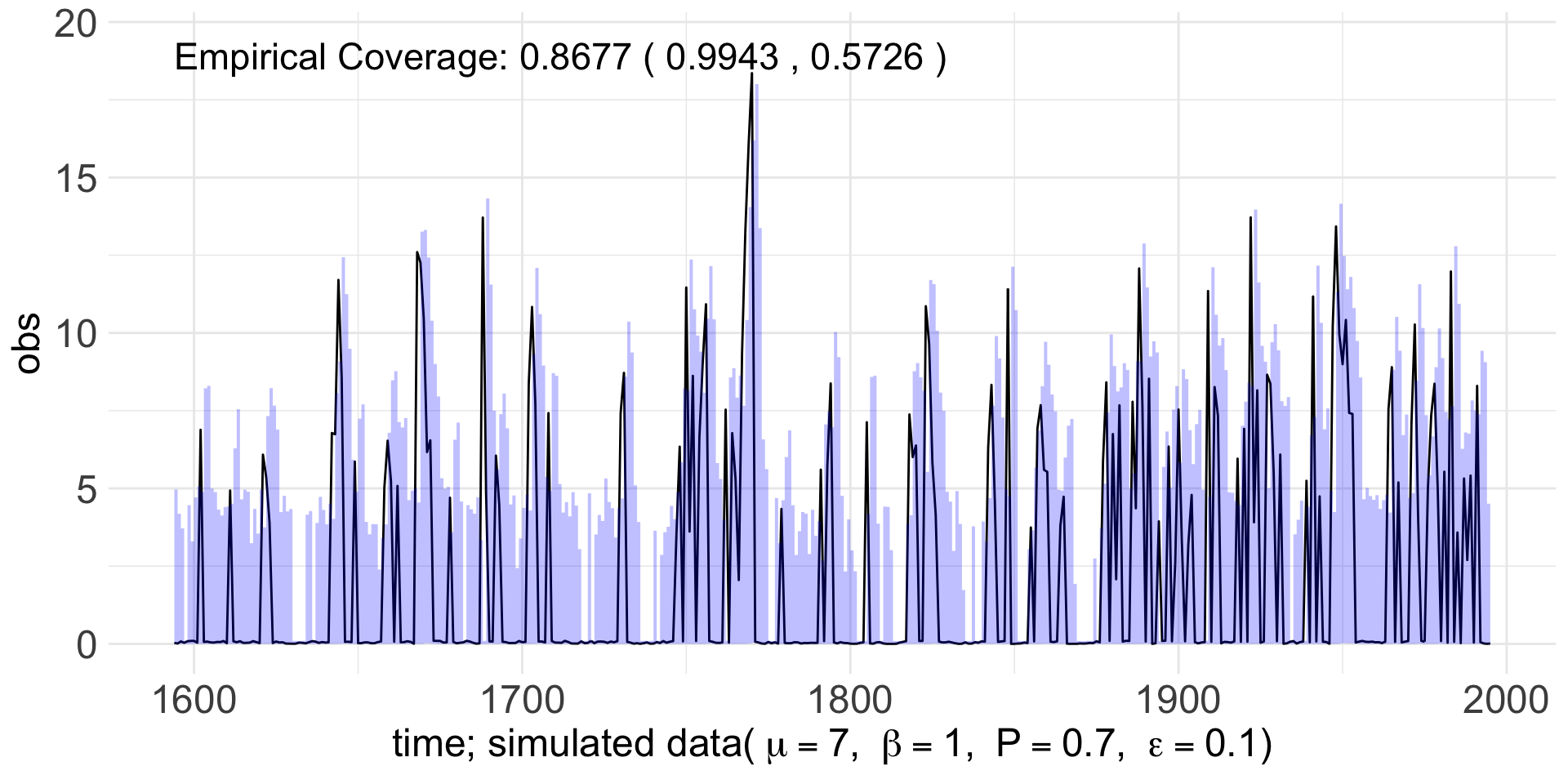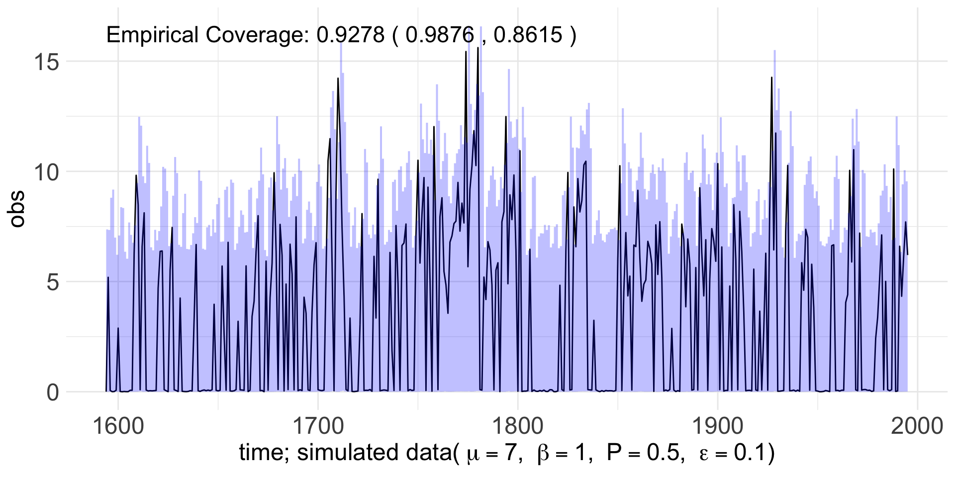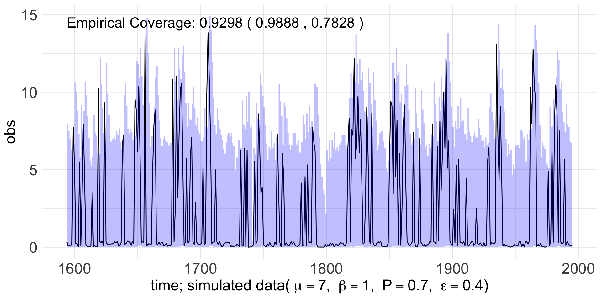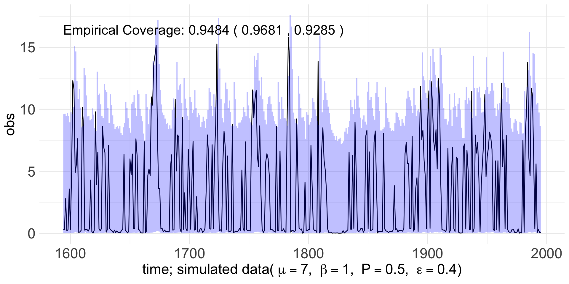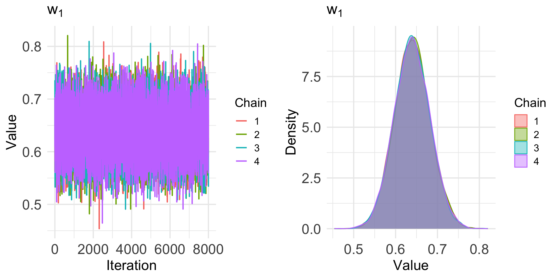 Simulate \(40\) replicates, combine \(4\) chains of \(8,000\) samples, calculate \(95\%\) CI, and record whether the true parameter value falls within this interval.