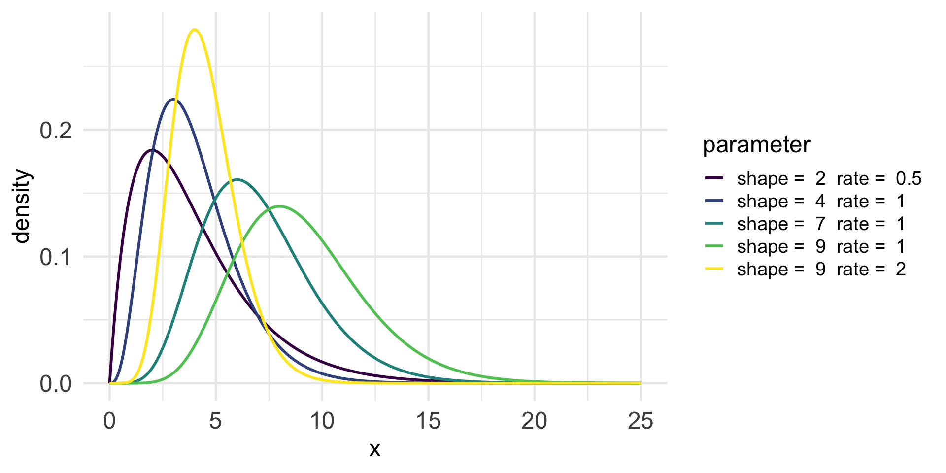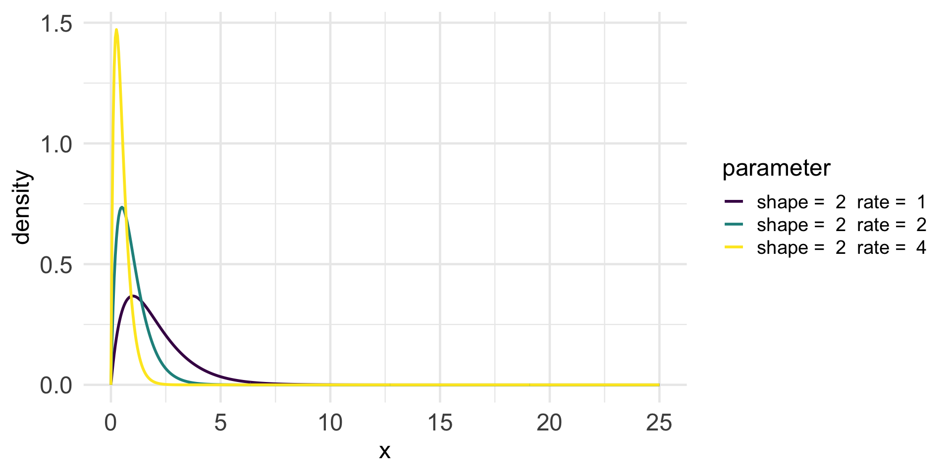 \[\begin{equation} f(y; \mu, \beta, \epsilon) = \frac{1} {\Gamma(\frac{\mu}{\beta}) \beta^{\frac{\mu}{\beta}}} {(y - \epsilon)}^{\frac{\mu}{\beta} - 1} \exp(- \frac{y - \epsilon} {\beta}) \quad y \geq \epsilon, \end{equation}\]where \(\frac{\mu}{\beta} > 0\) denotes the shape, \(\beta > 0\) the scale, and \(\epsilon > 0\) the threshold parameter.