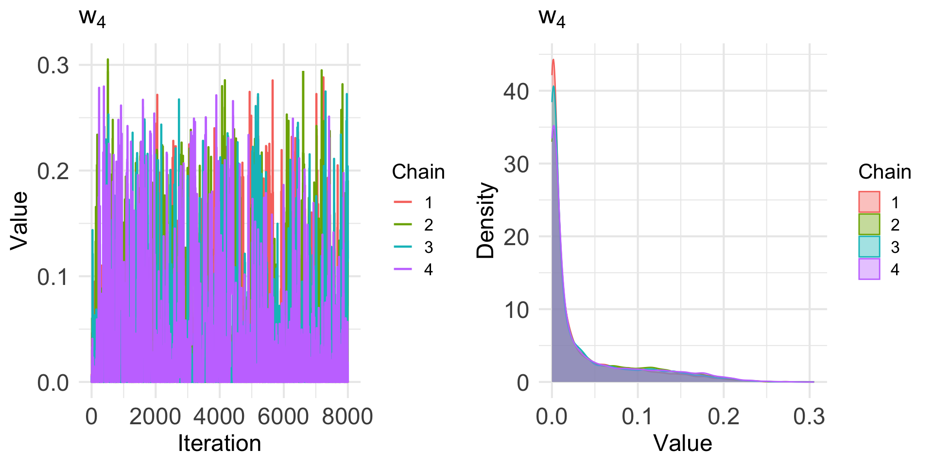\[\begin{equation} \begin{split} p(\boldsymbol{w}, \boldsymbol{\theta}, {\{z_t\}}_{t=L+1}^n | D_n) \propto \pi_w(\boldsymbol{w}) \prod_{l=1}^L \pi_l(\boldsymbol{\theta}_l) \\ \prod_{t=L+1}^n \Biggl\{ f_{z_t} (x_t | x_{t-z_t}, \boldsymbol{\theta}_{z_t}) \sum_{l=1}^L w_l \delta_l(z_t) \Biggl\}. \end{split} \tag{4} \end{equation}\]\(\boldsymbol{w}\) is the mixture weights. \(\boldsymbol{\theta}\) collects parameters for the transition kernel. \(D_n = {\{x_t\}}_{t=L+1}^n\) is the data.