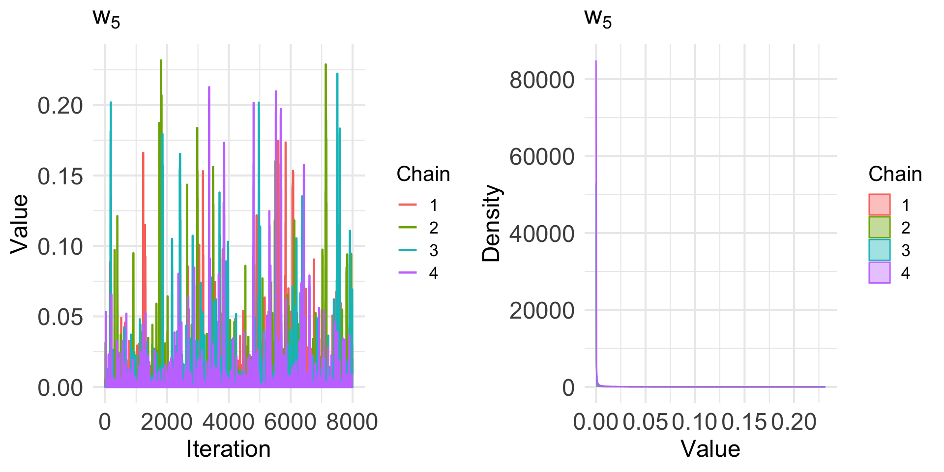 \[\begin{equation} w_l = G(l/L) - G((l - 1)/L), \quad l = 1,..., L. \end{equation}\]Next place a Dirichlet process prior on \(G\), denoted as \(DP(\boldsymbol{\alpha}_0, \boldsymbol{G}_0)\), where \(\alpha_0 > 0\) and \(\boldsymbol{G}_0 = Beta(a_0, b_0)\). 3