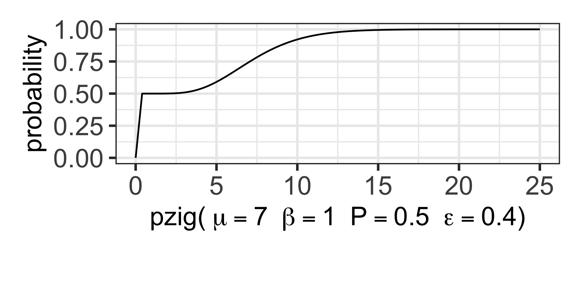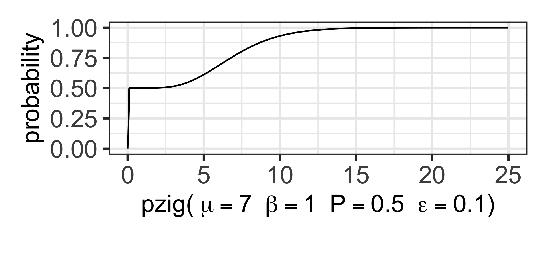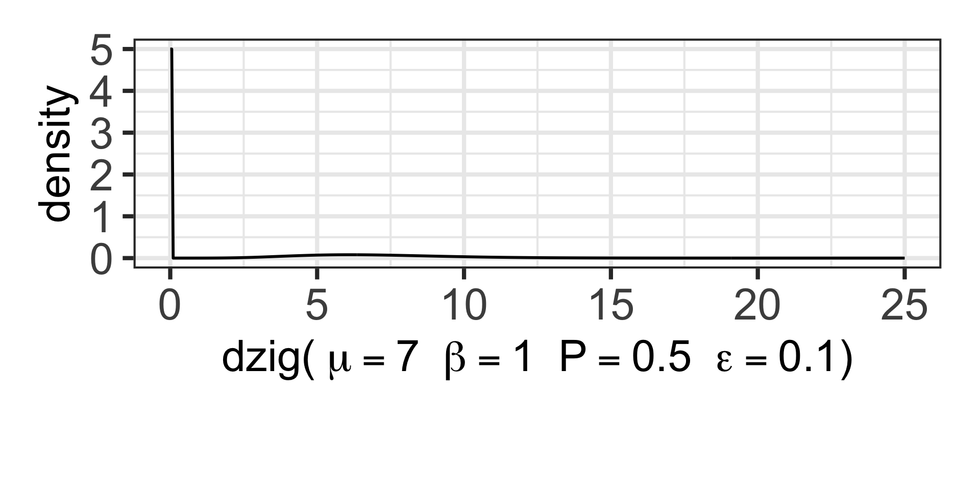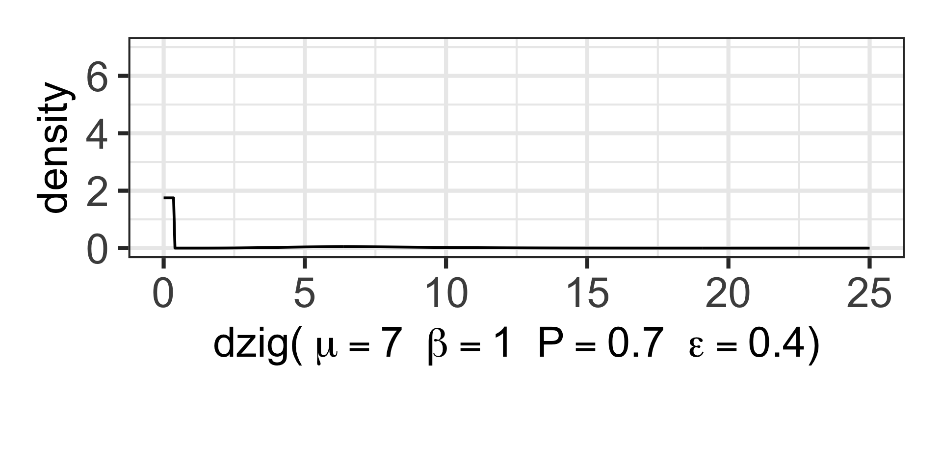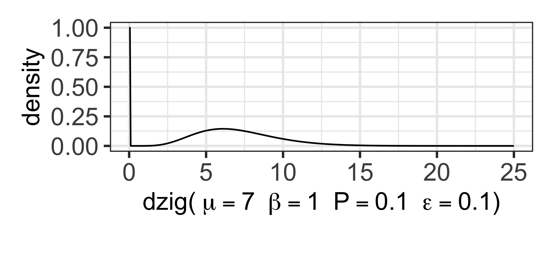 \[\begin{equation} f(x) = \begin{cases} \text{Unif}(0, \epsilon) & \text{with probability } P \\ \text{ShiftedGamma}(\mu, \beta; \epsilon) & \text{with probability } 1-P, \end{cases} \tag{7} \end{equation}\]where \(\mu\) denotes the mean and \(\beta\) the scale parameter of the shifted Gamma distribution, \(P \in [0, 1]\) the zero-inflated probability, and \(\epsilon > 0\) the threshold parameter.