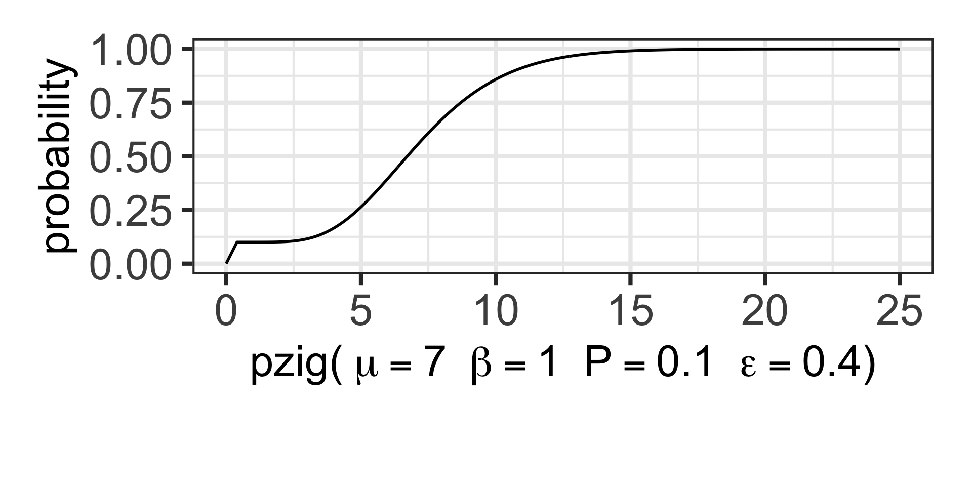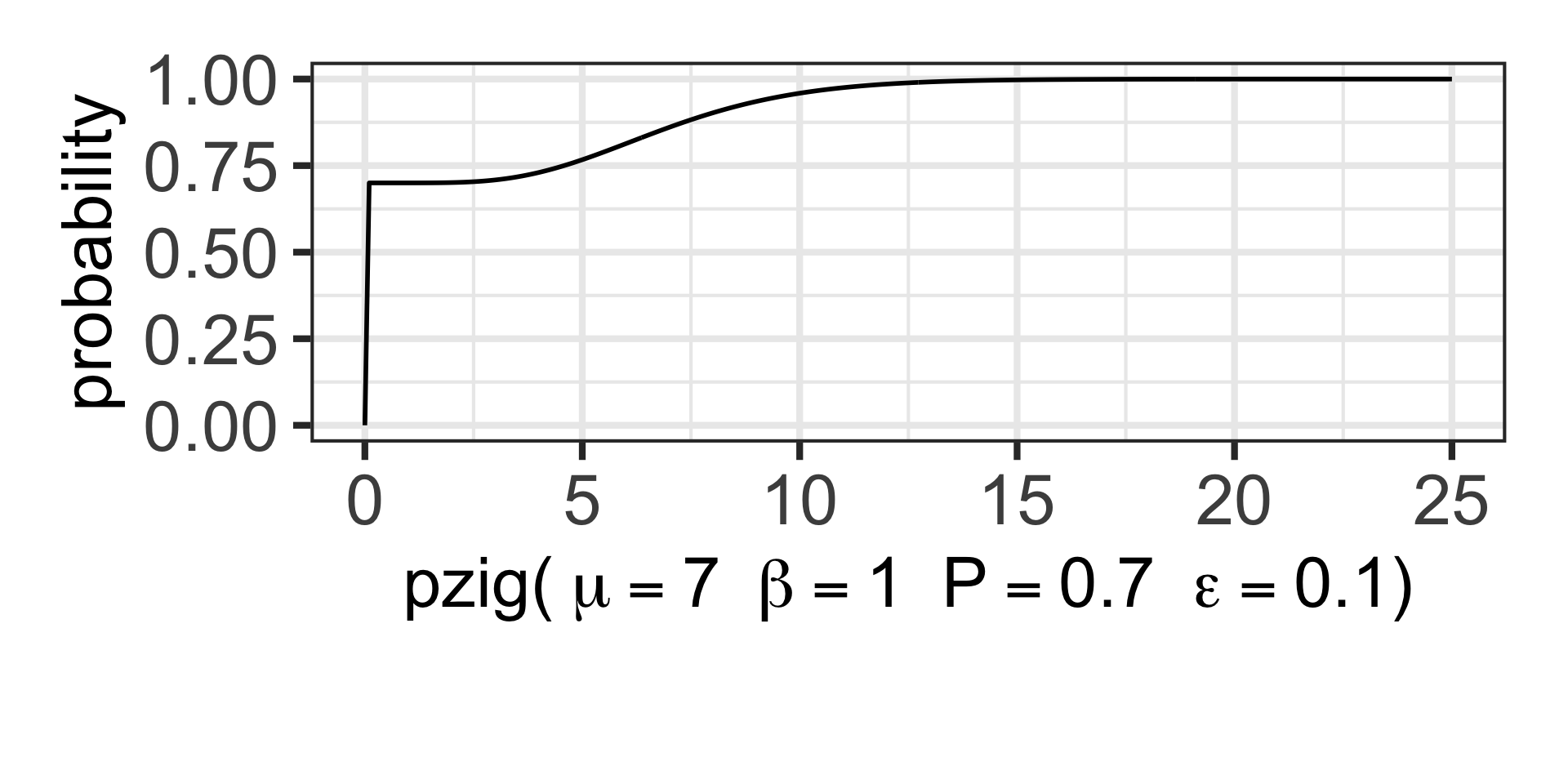 The resulting distribution, denoted as \(\text{ZIGamma}(\mu, \beta, P, \epsilon)\), is expressed as: