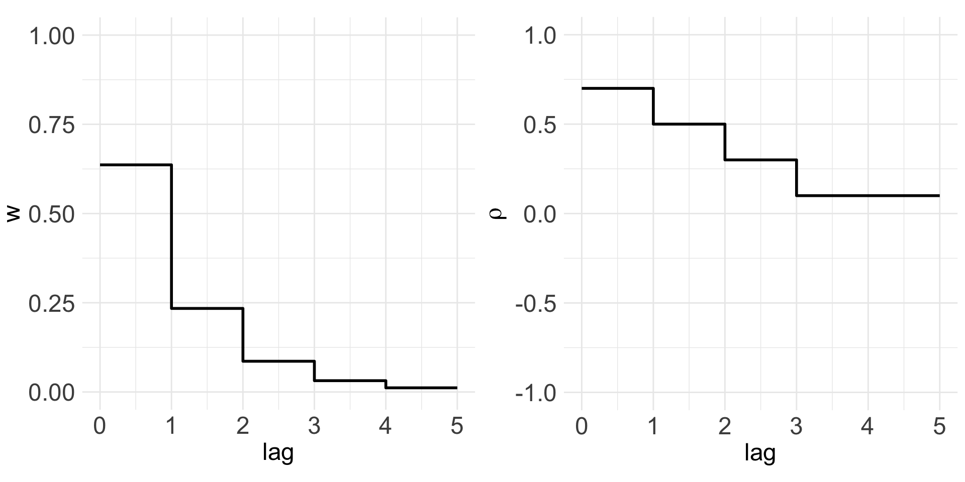 \[\begin{equation} f(x_t | \textbf{x}^{t-1}) = \sum_{l=1}^L w_l f_l (x_t | x_{t-l}). \tag{2} \label{eq:cond_distribution} \end{equation}\]\(f_l (x_t | x_{t-l})\) is the conditional pdf of \(X_t\) with respect to the \(l\)th transition kernel given that \({X}_{t-l} = {x}_{t-l}\). \(w_l\) are weight parameters, where \(w_l \geq 0\) such that \(\sum_{l=1}^L w_l = 1\).