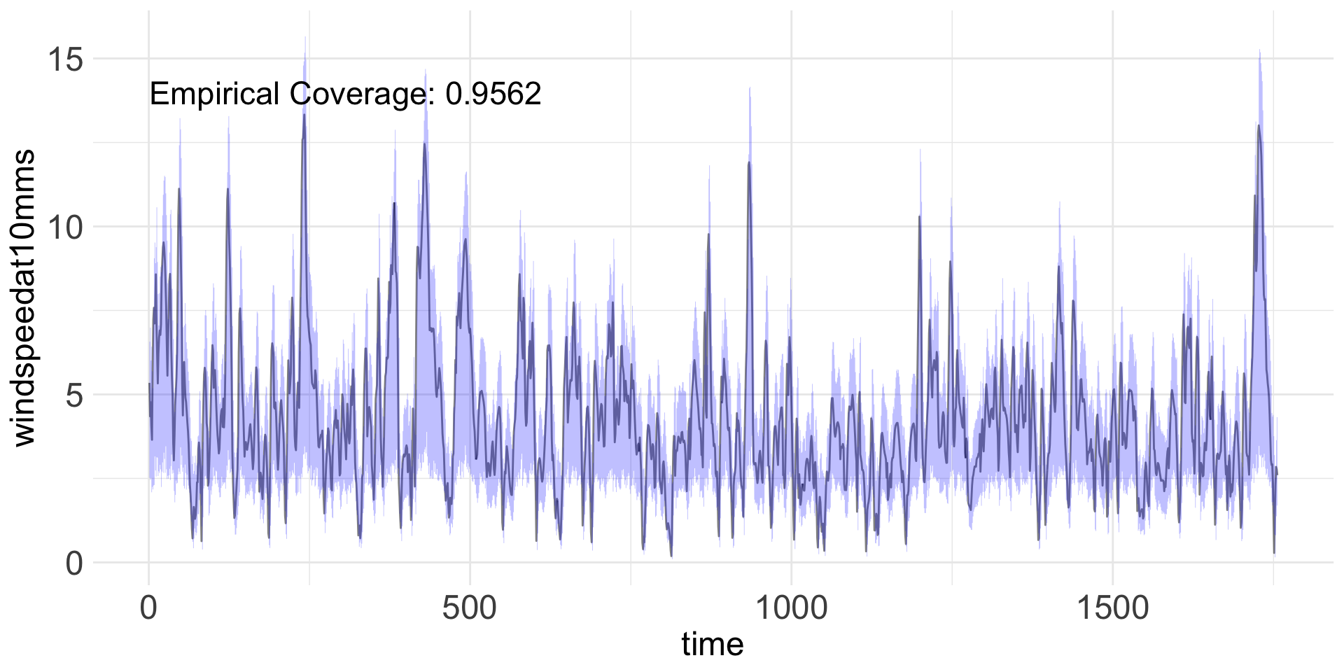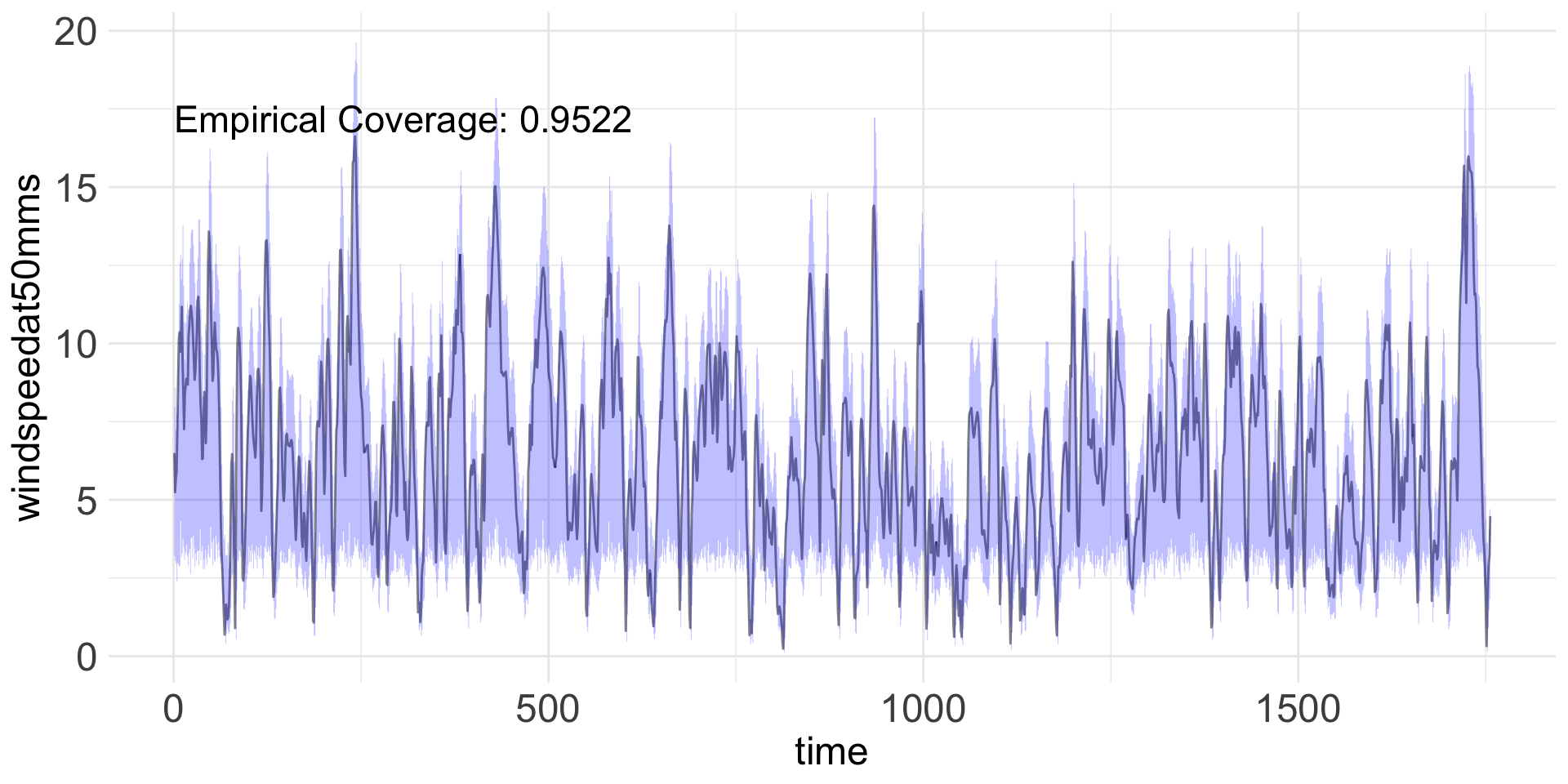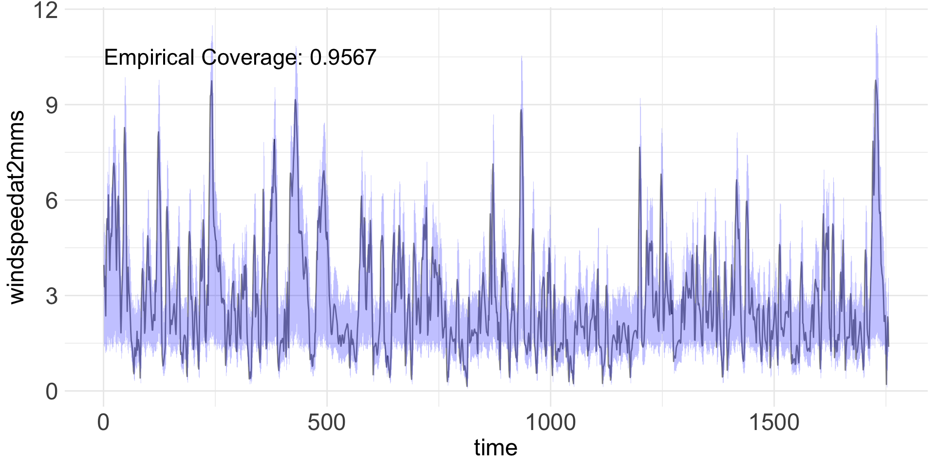 \[\begin{equation} f(x_t | \textbf{x}^{t-1}) = \sum_{l=1}^L w_l c_l (x_t, x_{t-l}) f_X(x_t). \tag{3} \label{eq:cond_distribution_copula} \end{equation}\]\(c_l (x_t, x_{t-l})\) is the copula density evaluated at \(x_t\) and \(x_{t-l}\), and \(f_X(x_t)\) is the stationary marginal density evaluated at \(x_t\).