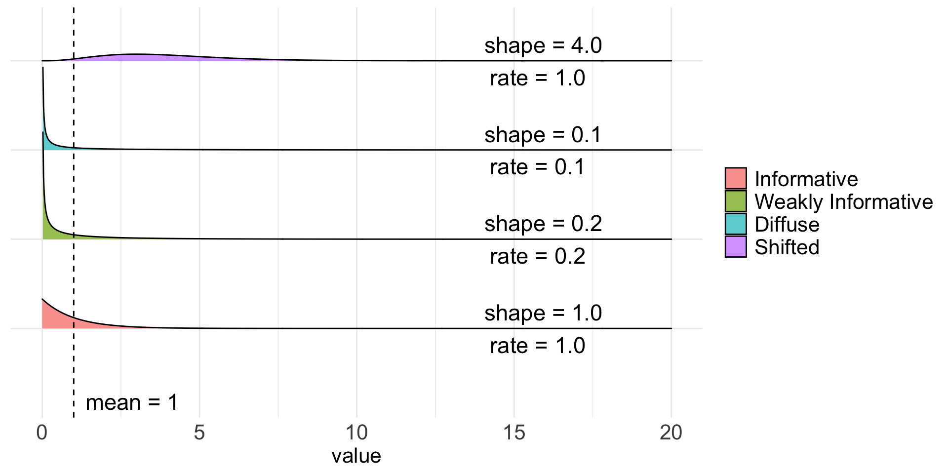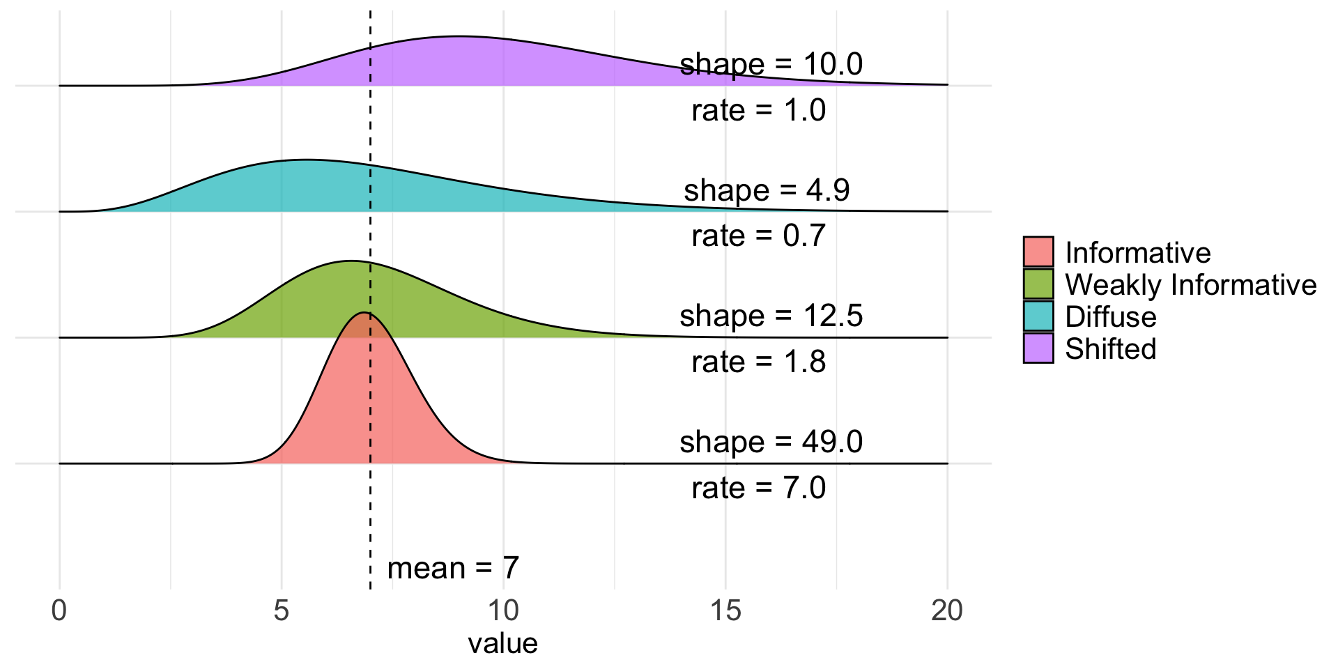| \(Gamma(49, 7)\) | \(Gamma(1, 1)\) | Informative prior for both \(\alpha\) and \(\beta\). |